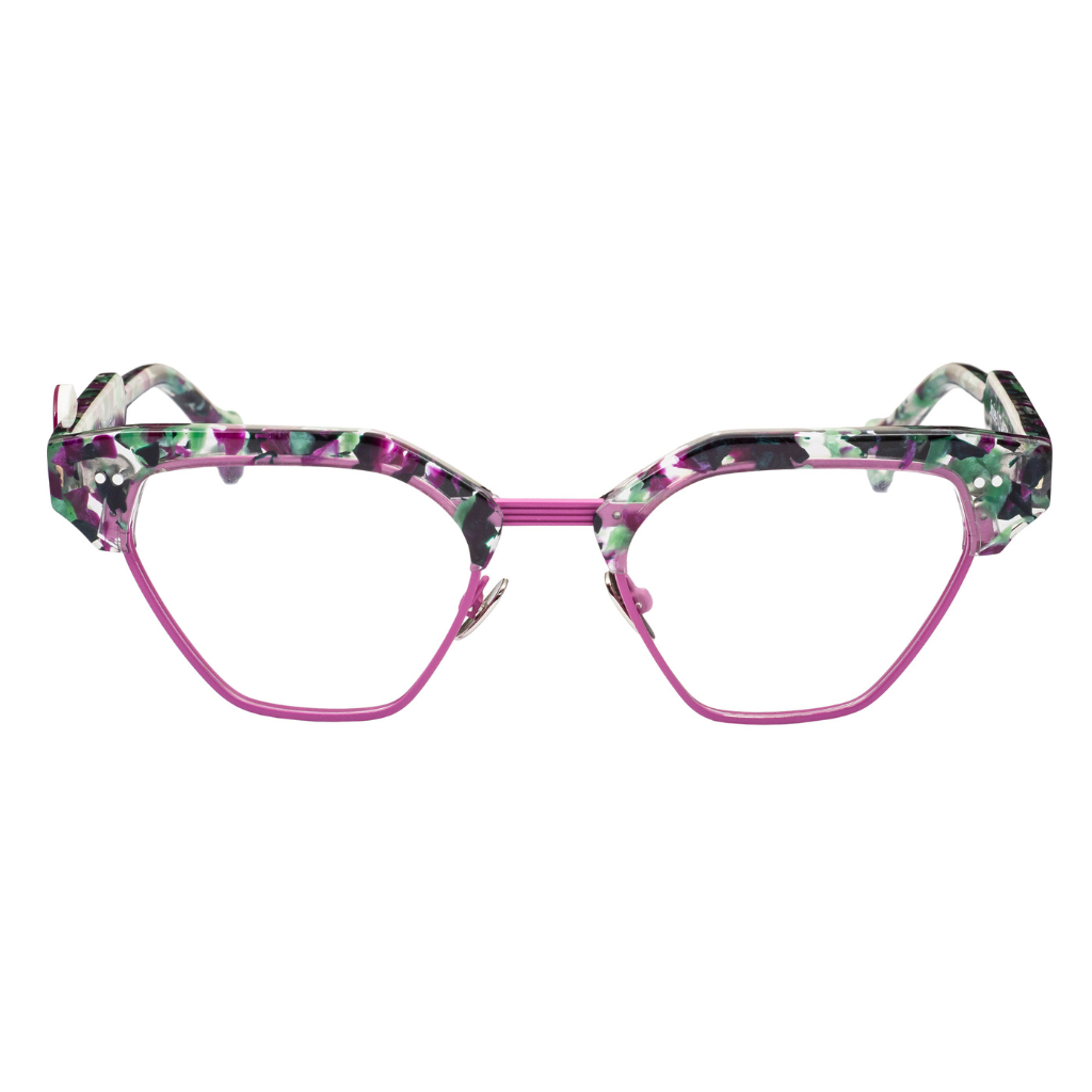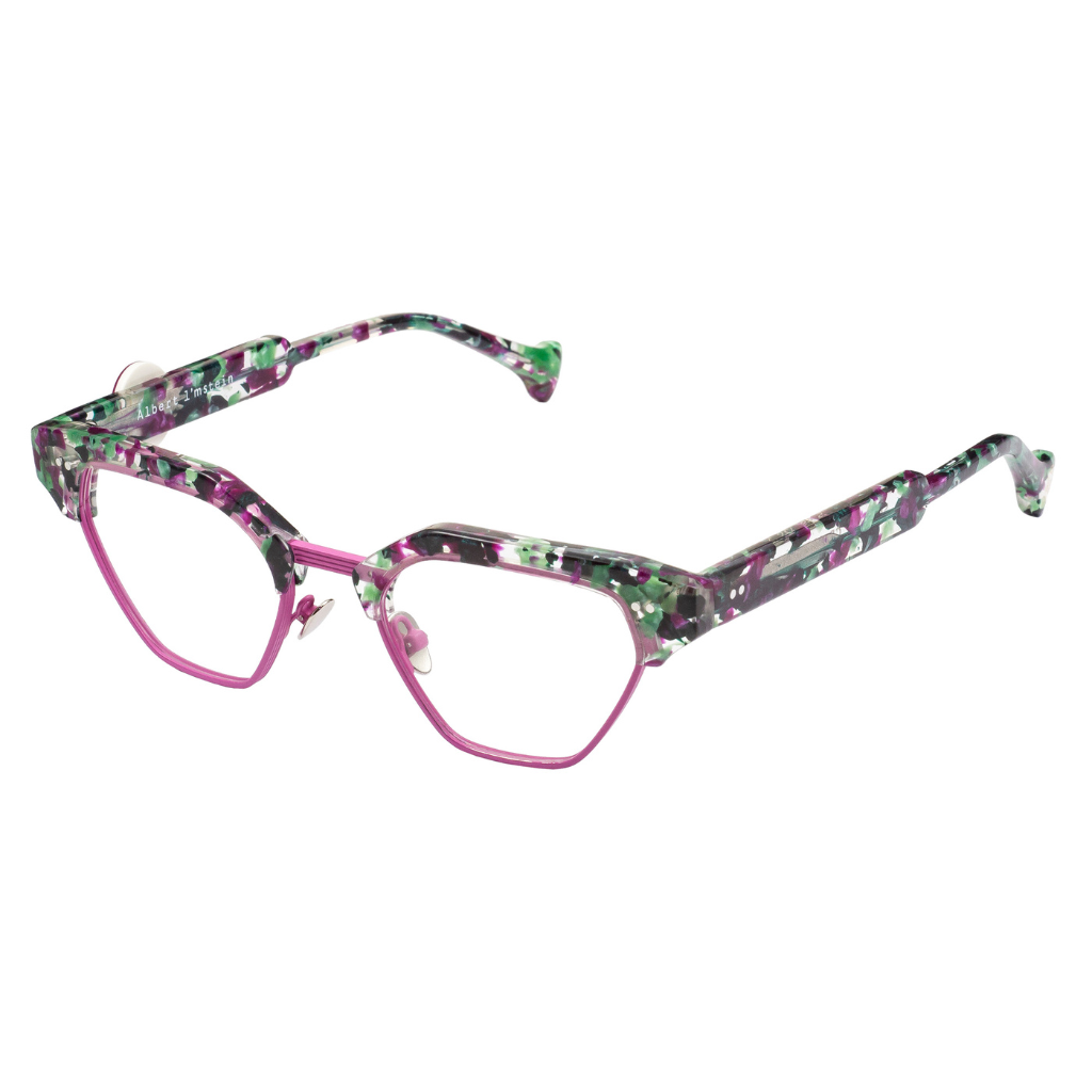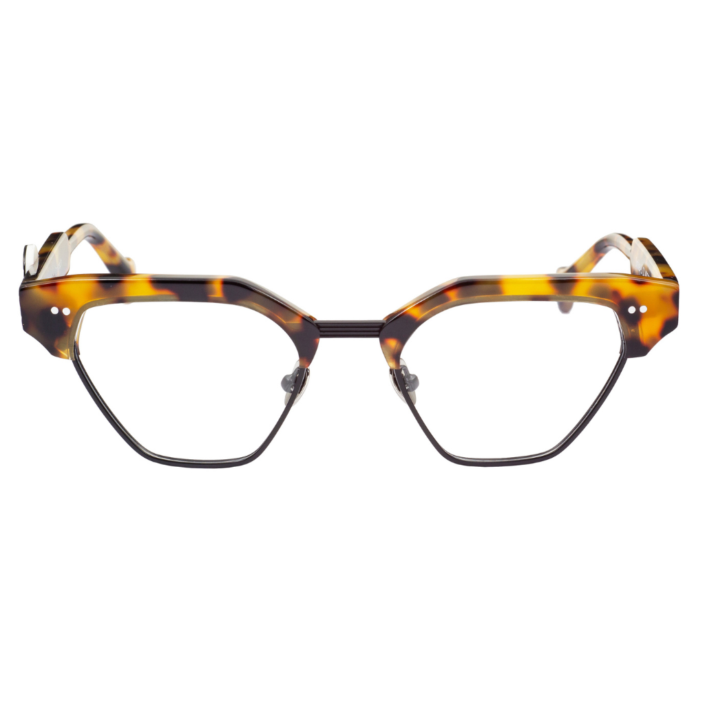 Stunning metal and acetate combination frame featuring a heavy brow and angular dimensions. A new classic from Albert I'mStein. Great for higher prescriptions and those who like the added joy of a smiley motif on the arm!